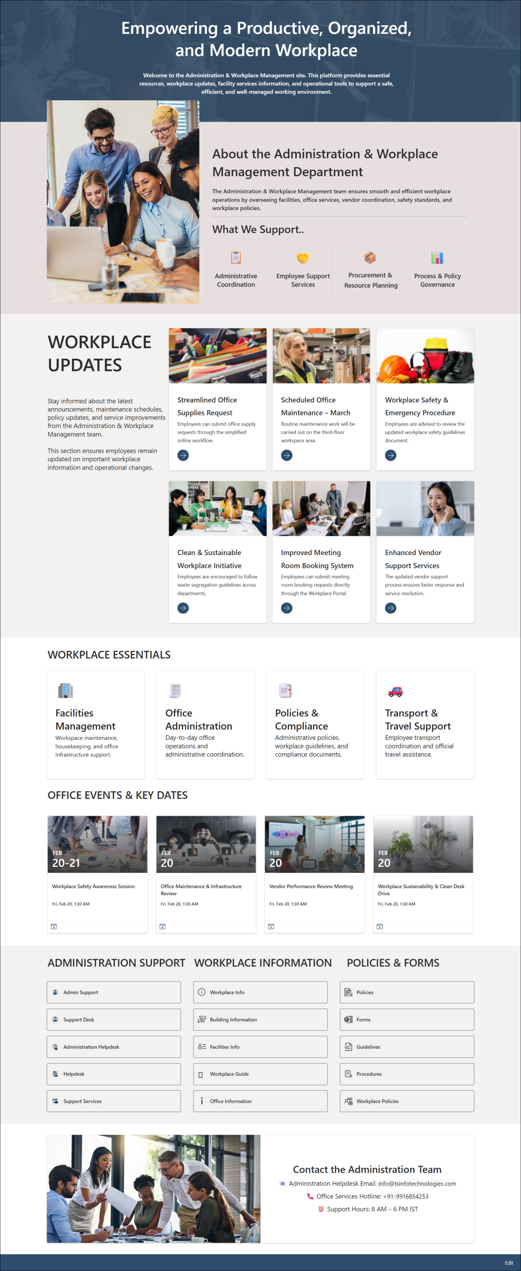 This Administration & Workplace Management Intranet Portal provides employees with easy access to administrative services, workplace updates, policies, and essential resources.
